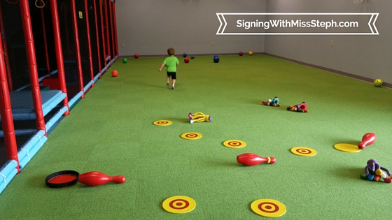 There are always lots of chances to sign as well - TAKE-TURNS, BALL, WAIT, and DANCE are probably our most frequently used signs while we're playing.